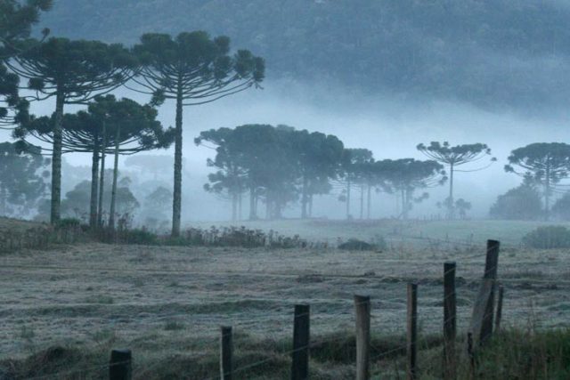 Uma massa de ar seco e frio de origem polar (centro de alta pressão) mantém tempo firme e ensolarado com pouquíssimas variações de nuvens entre os setores do Oeste, Meio Oeste, Planalto Sul e Litoral Sul. O fluxo de umidade que vem do oceano (padrão de circulação marítima) proporciona mais nuvens com nebulosidade variável e chuva fraca e garoa isolada entre o início da manhã e a noite, porém boa parte do dia segue com tempo seco e alternância entre sol e céu nublado. Temperatura baixa com mínimas próxima ou abaixo de 0/4ºC no Oeste, Meio Oeste, Planalto Sul e Litoral Sul podendo pontualmente negativa com formação de geada entre a madrugada e início da manhã nas baixadas e vales. No Topo da Serra as mínimas podem chegar -5/-8ºC com formação de geada forte nas baixadas e interior. Máximas na marca dos 16/19ºC no Leste do estado, 10/13ºC no Planalto Sul e 20/23ºC nos setores do Oeste. Vento de norte a nordeste com velocidade de 30/50 km/h no Oeste e Meio Oeste e com 15/40 km/h nas demais regiões.