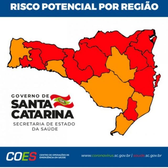 A Matriz de Risco Potencial divulgada nesta quinta-feira (7), pelo governo de Santa Catarina e Secretaria de Estado da Saúde (SES) classifica dez das 16 regiões de saúde catarinenses como em alerta gravíssimo (cor vermelha) para transmissão do novo coronavírus.