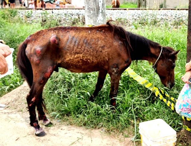 Servidores da UVZ foram até o local para resgatar o animal e aplicar os primeiros socorros. O cavalo é idoso (cerca de 20 anos), estava em avançado estado de desnutrição, diversas lesões e úlcera de pressão por estar há dias deitado na mesma posição. Ele conseguiu ficar de pé, comeu e bebeu água, mas a recuperação é incerta por conta da idade avançada e da delicada situação de saúde em que se encontrava.