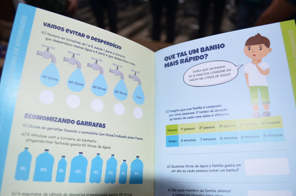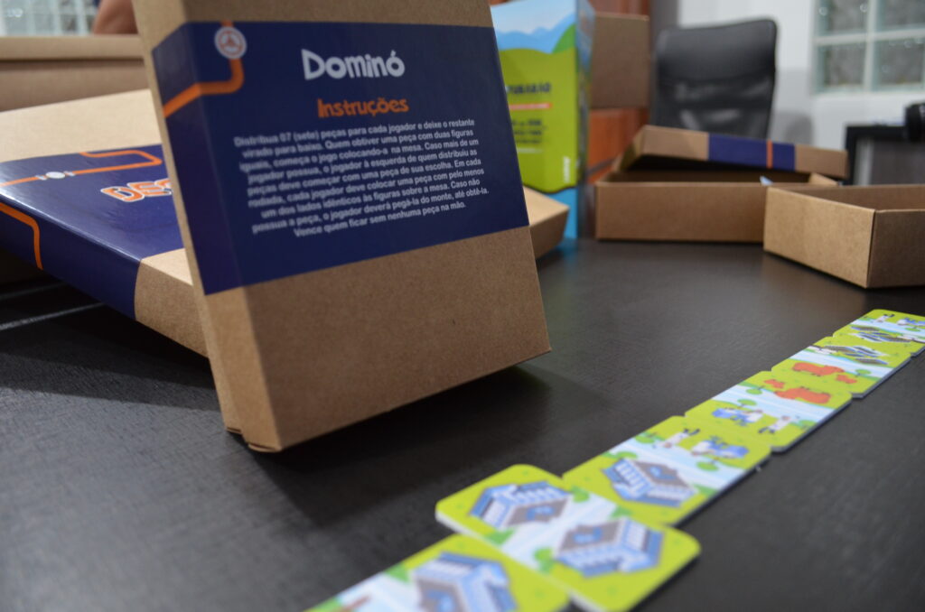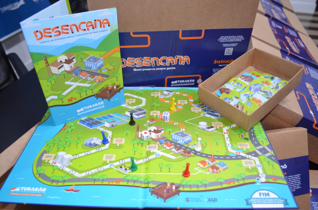 A produção dos kits ficou por conta da própria Tubarão Saneamento, com a impressão final dos materiais no comércio local. A caixa contém um caderno de atividades, semelhante a um almanaque, com atrações como caça-palavras e jogo dos 7 erros, dominó, jogo da memória e o tabuleiro.