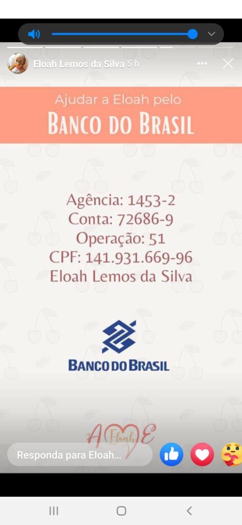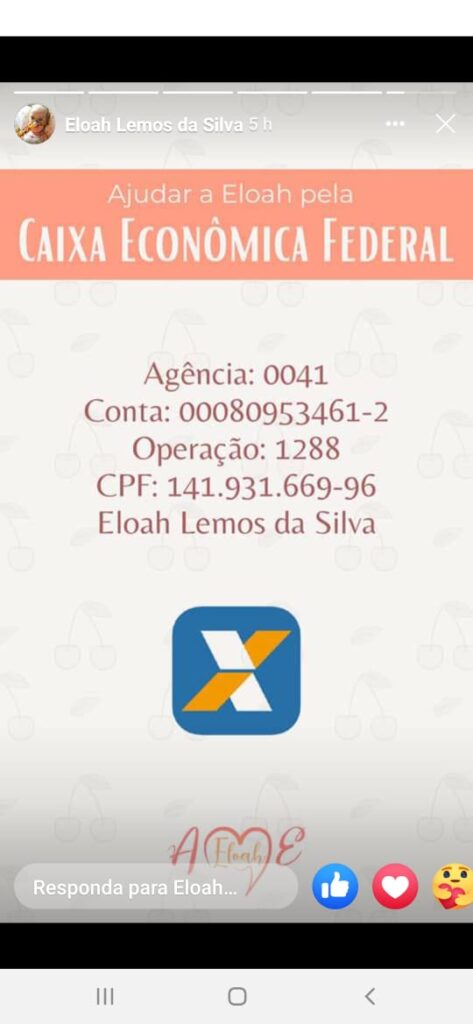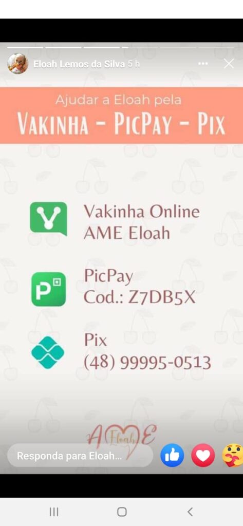 Caso alguém queira ajudar de alguma forma, a chave Pix de Eloah está disposta na imagem abaixo. Sobre a vaga na UTI pediátrica, o HNSC ainda não se posicionou. Alguns políticos, inclusive deputados estaduais já se prontificaram em ajudar de alguma forma a família e já estão fazendo sondagens no Estado para viabilizar um leito mais específico e necessário à menina.