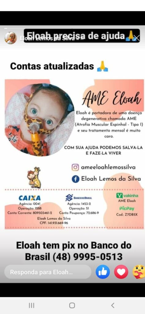 Eloah sofre de uma doença degenerativa chamada Atrofia Muscular Espinhal (AME) tipo 1. Seu caso é acompanhado pelos tubaronenses desde quando a família descobriu o diagnóstico, há dois anos e três meses. O tratamento foi imediato, passou a usar VNI (ventilação não invasiva), além de remédios.