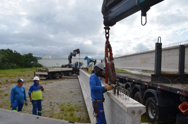 As duas vigas vieram da sede da empresa Traçado, vencedora do processo de licitação, em Erechim (RS), e foram descarregadas em um terreno no bairro Revoredo. As estruturas serão levadas ao canteiro de obras no momento de serem içadas sobre as colunas de apoio no Rio Tubarão, mesmo procedimento utilizado durante a construção da ponte Prefeito Paulo Osny May.