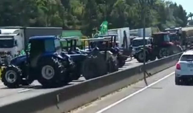 Mais cedo, manifestantes haviam bloqueado este trecho da rodovia, no sentido sul. Aproximadamente 10 tratores e 30 pessoas ocupavam a via.