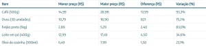 * Variação Extrema: Cinco itens específicos apresentaram as maiores oscilações. Em alguns casos, o preço de um produto chega a ser quase 100% maior de um mercado para outro.